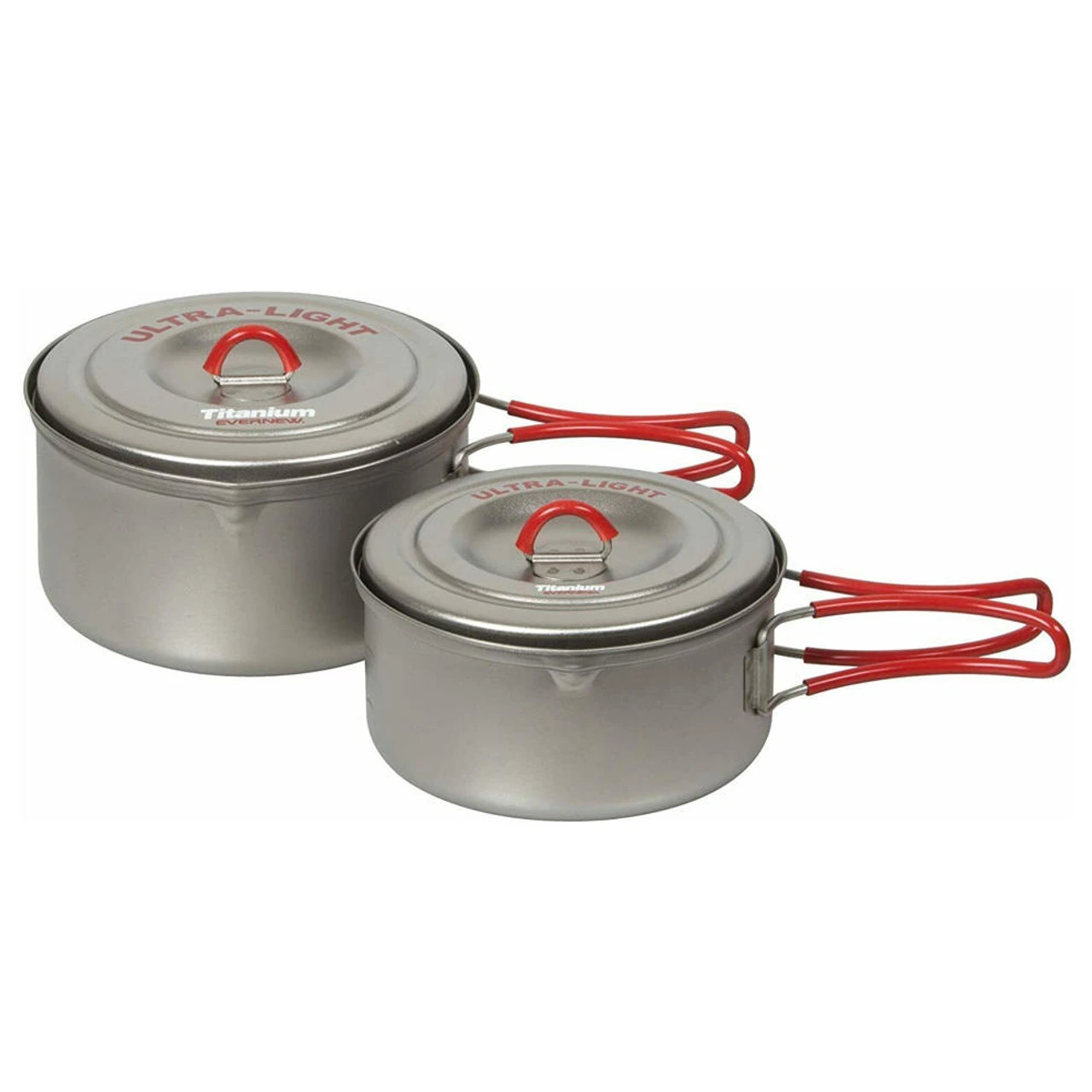 Evernew’s ECA-259R Titanium Ultralight Pot Set 0.6L and 0.9L provide useful flexibility for one person or two at a pinch. The smaller pan will boil enough water for two cups of coffee and the larger will contain food for two – but if you do more than just simple cooking then the bigger pan may still be too small.