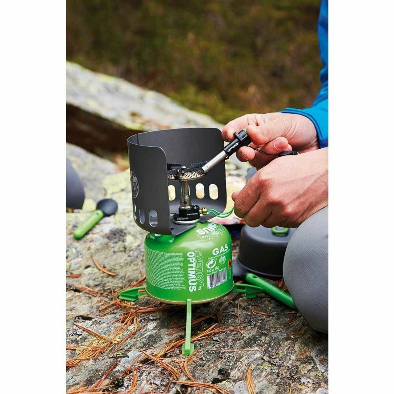 Optimus’s Windshield is designed for use with canister mounted stoves – it grips the neck of the gas canister and provides 180 degree protection from the wind.