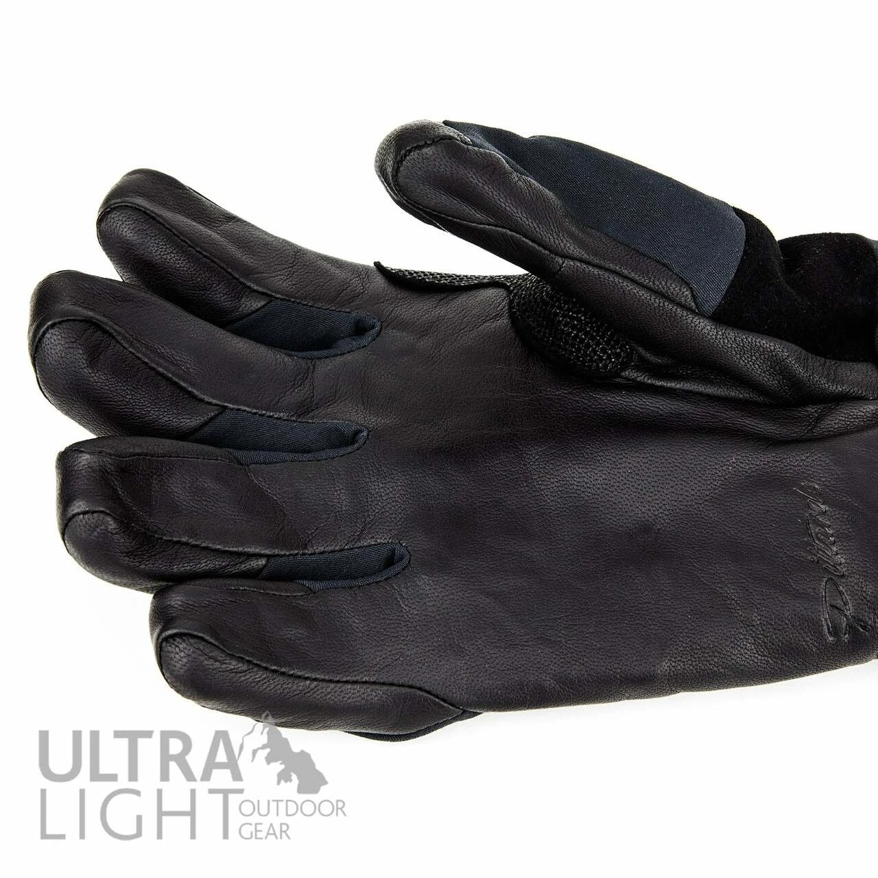 Knuckle reinforcement, a leather palm and nosewipe, and leather reinforcement in key wear areas make the Fulcrum GTX Glove a lightweight and dextrous winter climbing glove.