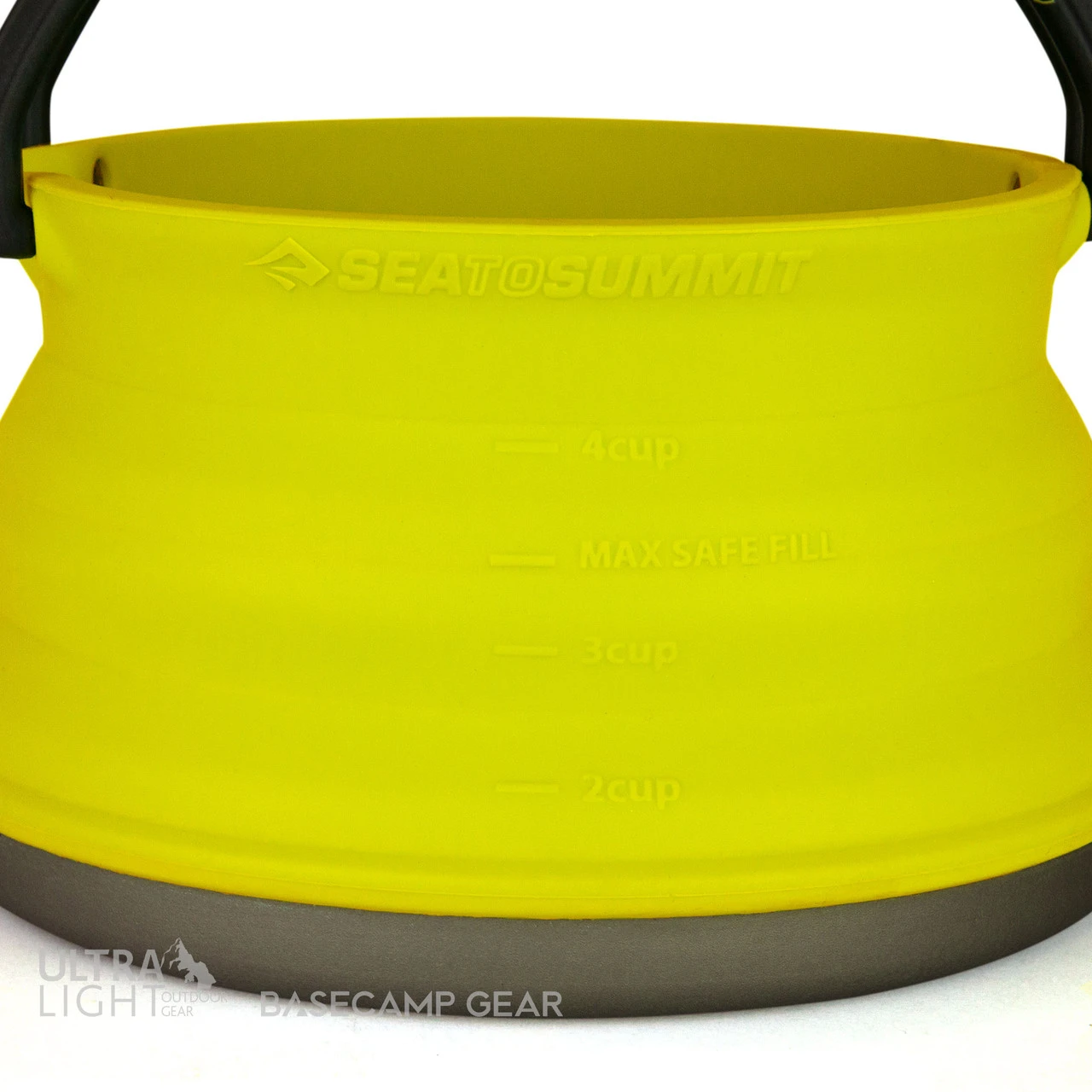 The X-Kettle is a tiny addition to your kit collapsing to 35mm (1 3/₈”). A 1.0L safe boiling capacity is perfect for a cup of tea or cocoa on the trail. With the increasing popularity of freeze dried food the kettle is all you need for two warm meals in one boil. If you prefer fresh rice or pasta the wide rim and stable handles allow it to be used as a 1.3L pot with easy stirring.