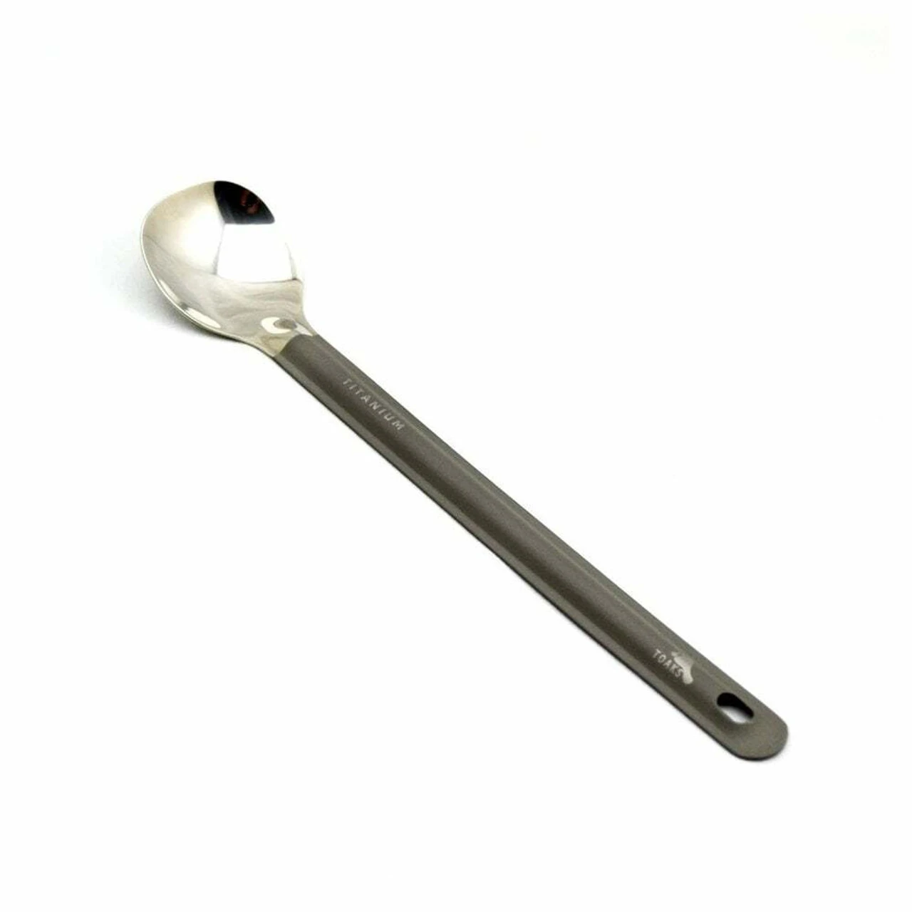 This lightweight Toaks long handled spoon features a smooth polished bowl with a matte finish handle for solid holding. The Titanium construction is ideal if you want luxury and durability without the added weight.