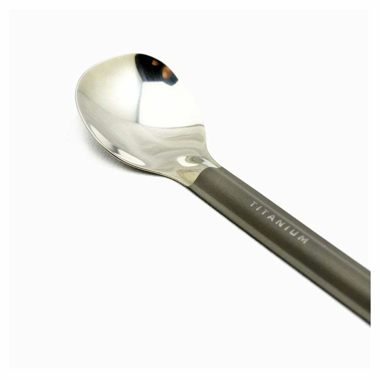 Lightweight titanium long handle spoon with polished bowl and matte finish handle.