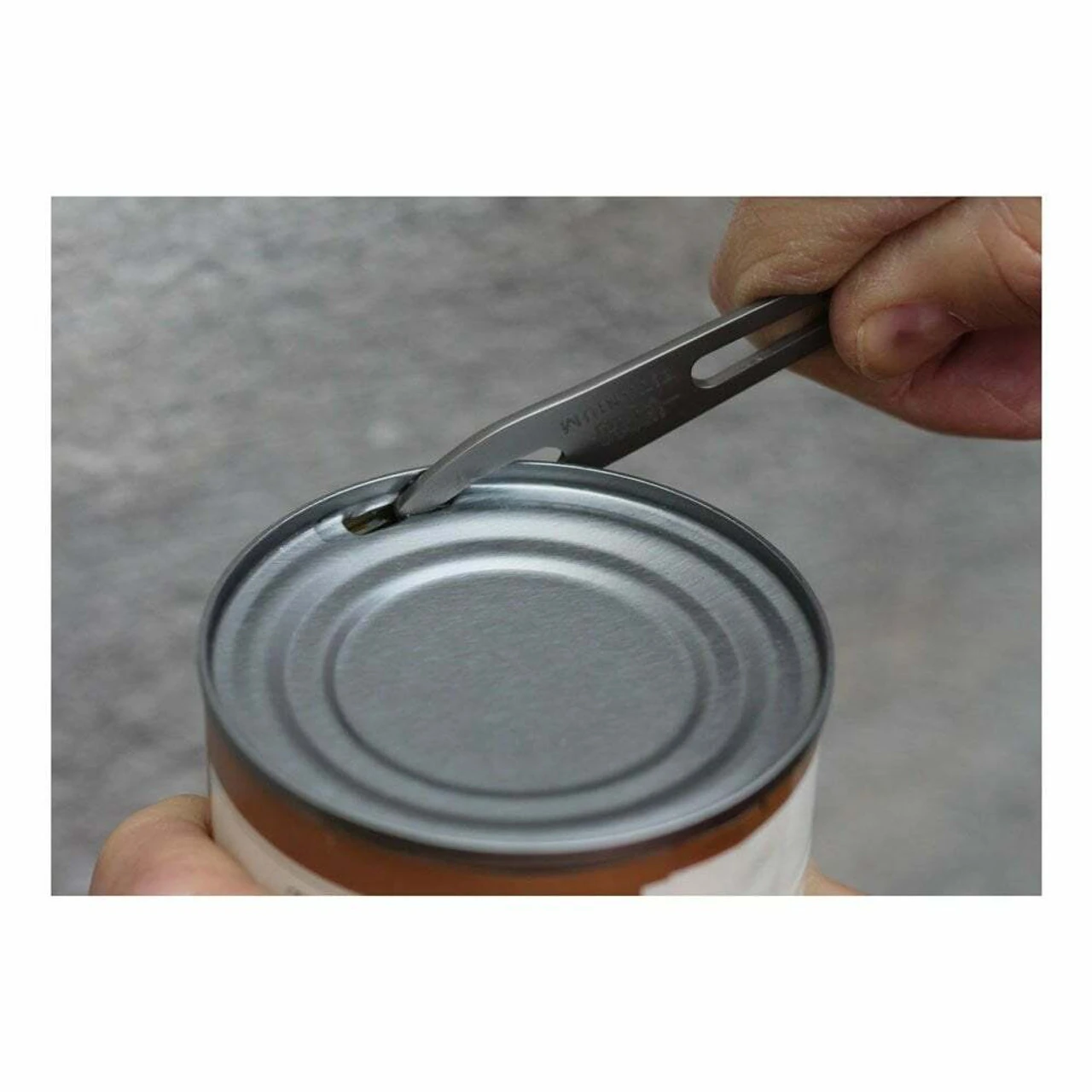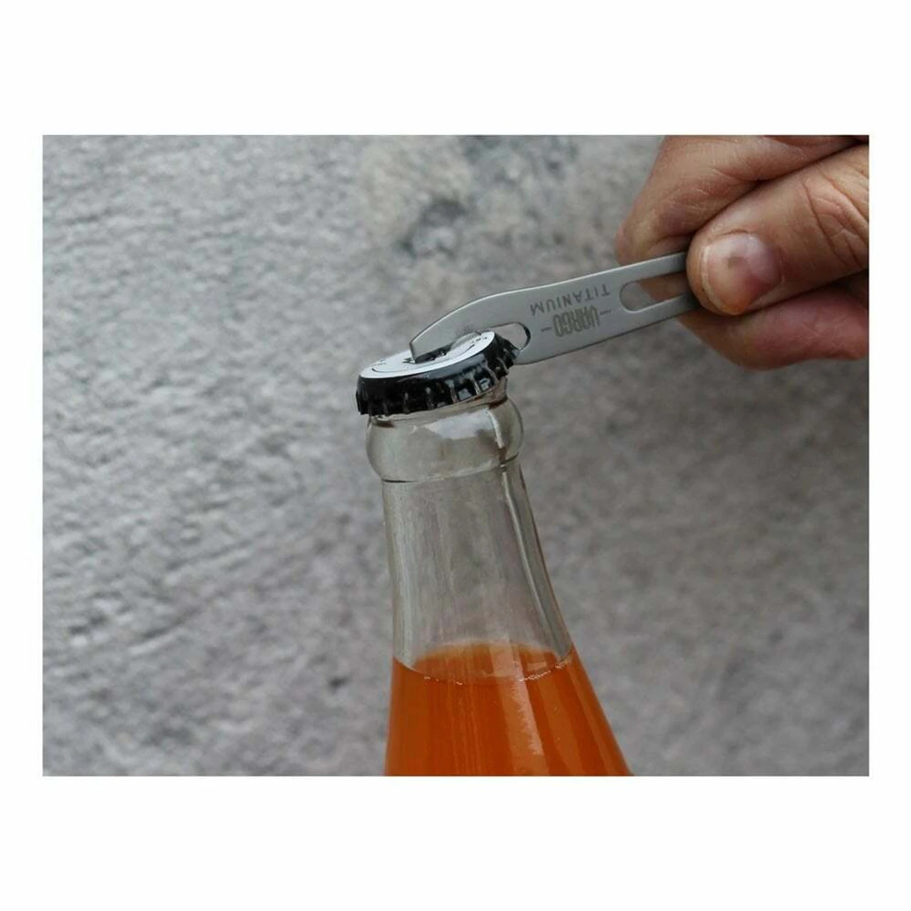 A Lightweight, titanium utensil that combines fork, spoon and a bottle and tin opener.